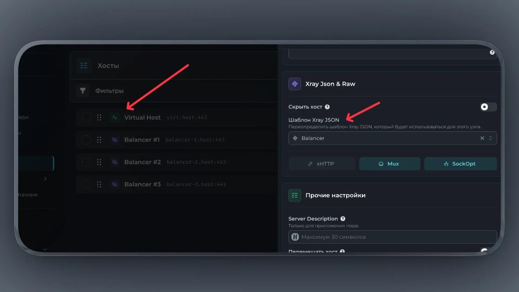 proxy,proxy-2,proxy-3) подставлены в начало массиваoutbounds, передdirectиblock. "selector": ["proxy"]в балансировщике автоматически захватил все три outbound'а, поскольку их теги начинаются сproxy(префиксное сопоставление)."subjectSelector": ["proxy"]в обсерватории аналогично подхватил все три outbound'а для мониторинга."remarks": "Virtual Host"— взято из примечания виртуального хоста.