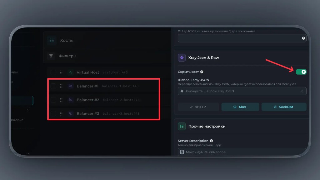 selectFrom: "HIDDEN"). Это поведение можно изменить на"NOT_HIDDEN"или"ALL". Если хост выключен или не найден по селектору — он будет пропущен. - Все участвующие хосты должны быть доступны конечному пользователю — инбаунд, к которому они привязаны, должен быть включён в сквад пользователя.